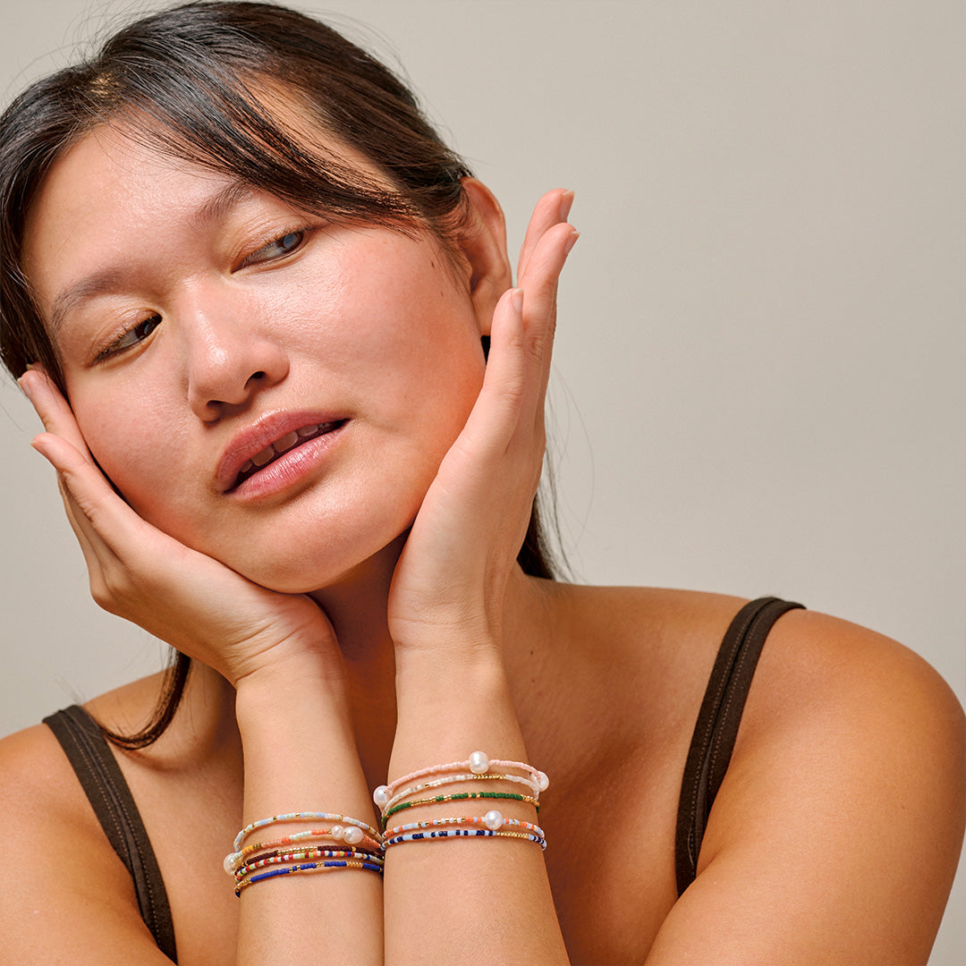 About the jewelry: The Coralia color combination creates a soft and playful expression, where the delicate shades beautifully intertwine. The delicate mint green tone adds freshness and a cool lightness, while the warm coral colors bring life, energy, and a touch of summer. In between, the white freshwater pearls shine with their white glow, elegantly tying the colors together.