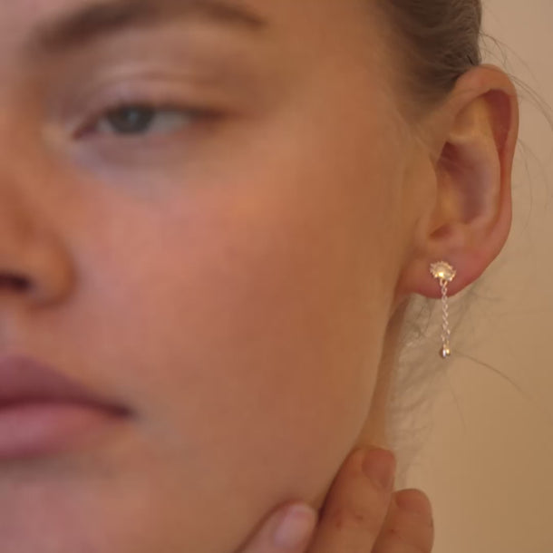 About the jewelry:Sunshine Drop, in silver, consists of a delicate sunflower sun, with a small piece of chain underneath, where a silver ball hangs. The earring is delicate and small, but with plenty of character, as it is playful, colorful, and unique. It's also an ideal everyday earring, so you just have to decide which version is your favorite. Sunshine Drop is also available in gold, as well as with a colorful enamel ball at the bottom.