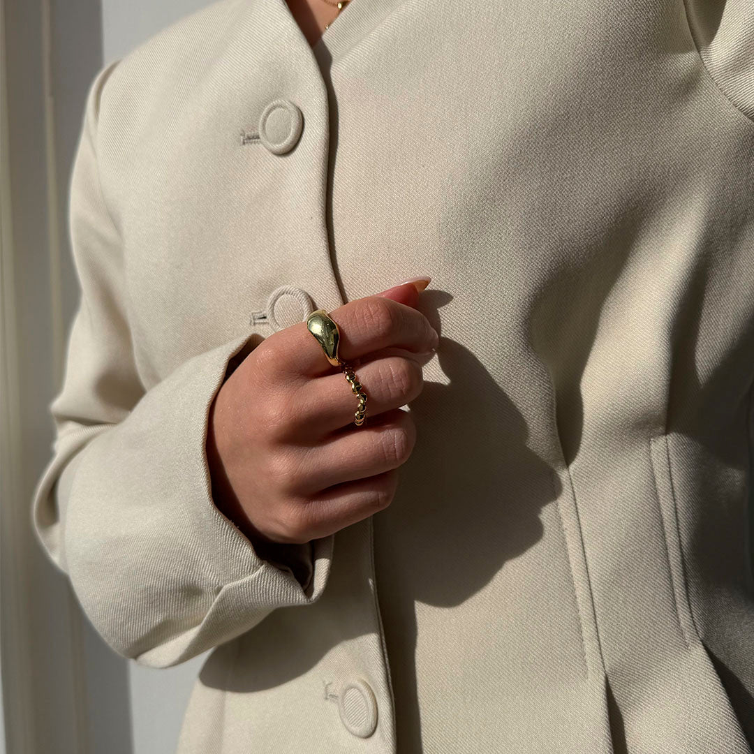 Unsere Agnete-Ringe gibt es in zwei Ausführungen, groß und klein. Die zarte und weiche Form der Ringe in Kombination mit ihrer schönen, polierten Oberfläche sorgt für einen klassischen und doch modernen Look. Agnete Large ist der perfekte Ring für jeden Tag, klobig und voller Charakter, der zu jedem Stil passt. Agnete Large gibt es in Gold und Silber und wenn er Ihnen zu klobig ist, sollten Sie sich den Agnete Small-Ring ansehen.