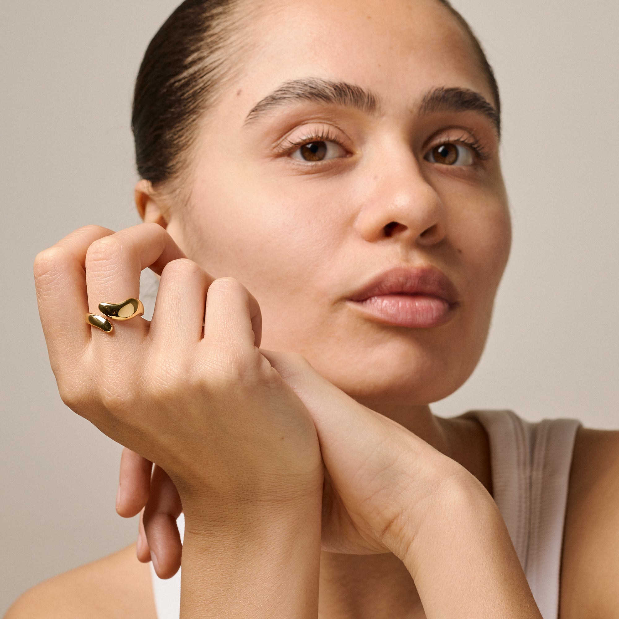 About the jewelry: The Neli Ring, plated with 18 karat gold, is designed with inspiration from the soft movements of nature. It has an elegant, open silhouette with voluminous shapes that wrap around the finger. The shiny gold surface provides an exclusive and modern expression, while the adjustable size ensures it fits perfectly for you – no matter the occasion. The Neil ring is also available in silver.
