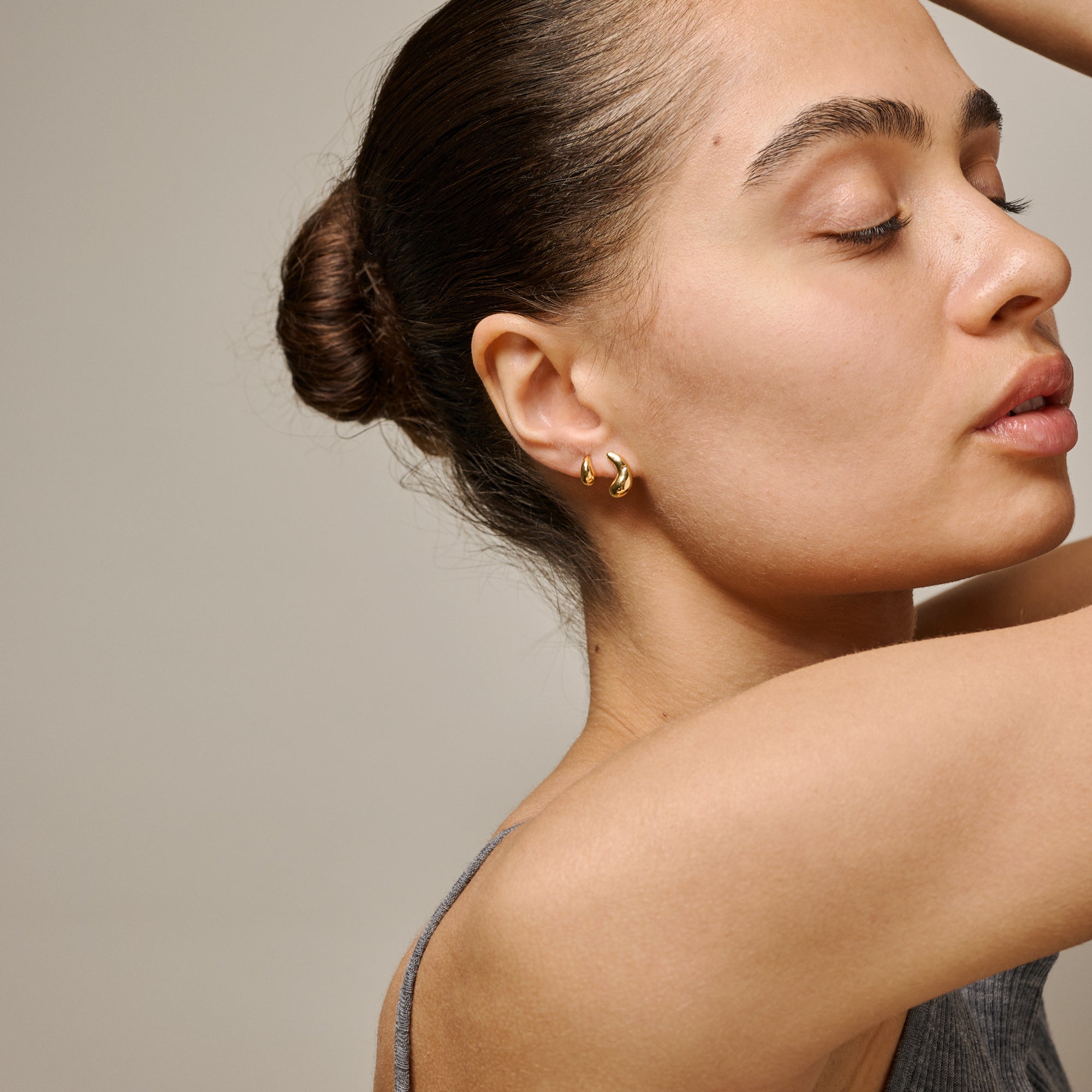 About the jewelry:Nima Stud is a small, elegant earring with a soft, organic shape and a gently rippled surface. The shiny finish gives it an exclusive touch, and the compact design makes it ideal for both everyday and more refined looks. Wear it alone for a minimalist expression – or combine with several styles for a personal styling. Nima stud is coated with 18 karat gold, but is also available in a silver version.