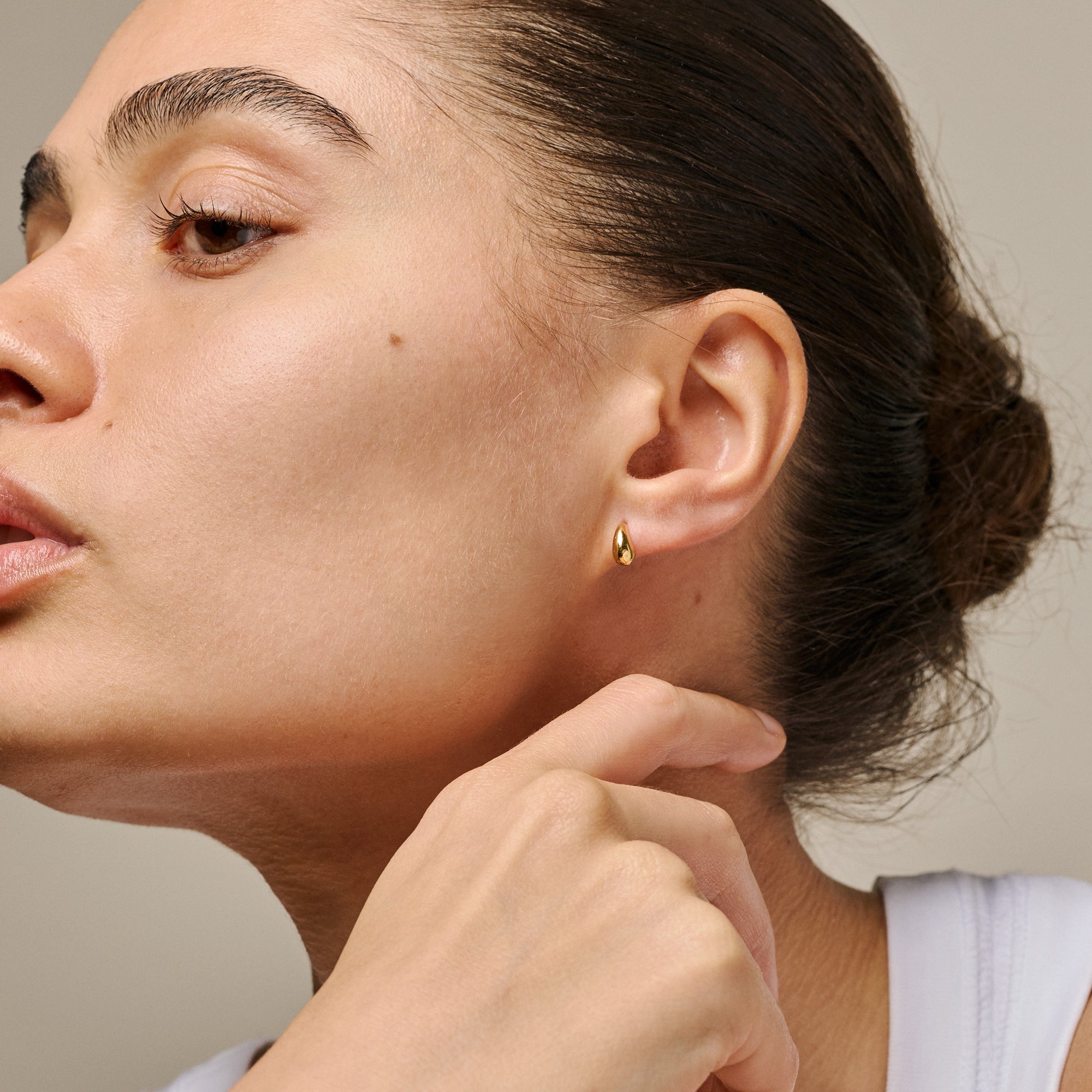 About the jewelry:Sana Stud, in gold, is an elegant ear stud with a droplet-like, organic shape. The minimalist design and shiny finish create a calm, feminine balance. Sana works beautifully on its own, but can also be mixed with other ear studs for a personal and modern styling. You can also find Sana stud in a pure silver version.