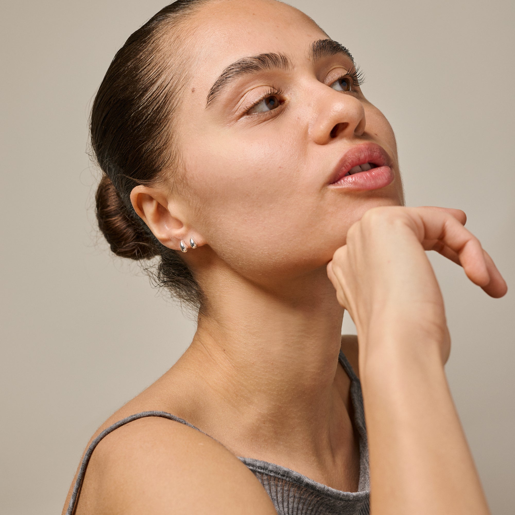 About the jewelry:Sana Stud, in silver, is an elegant ear stud with a droplet-like, organic shape. The minimalistic design and shiny finish create a calming, feminine balance. Sana looks beautiful on its own but can also be mixed with other ear studs for a personal and modern styling. Sana stud is also available plated with 18 karat gold.