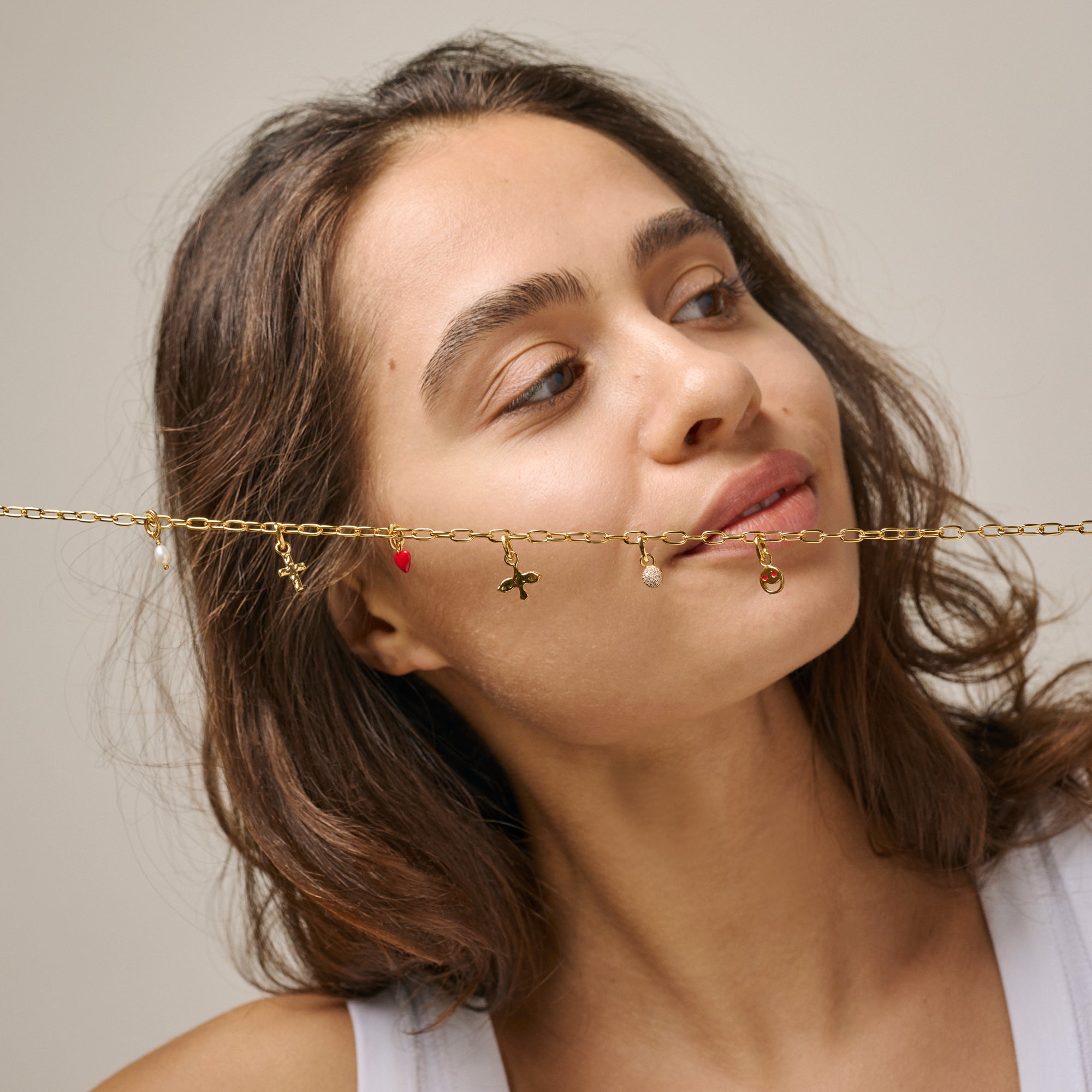The Medium Charm necklace is part of our charms concept, consisting of many beautiful, handmade charms that can be combined in various ways and added to many of our styles. On the Medium Charm necklace, you can attach one or more of our wonderful charms to complete the look. The necklace is on the slightly chunkier side, yet is super exclusive and feminine. The clasp can be fastened at any point, making it a very flexible necklace in terms of size.