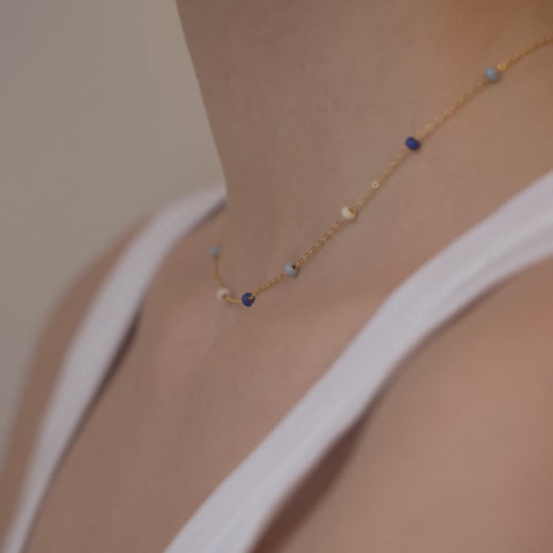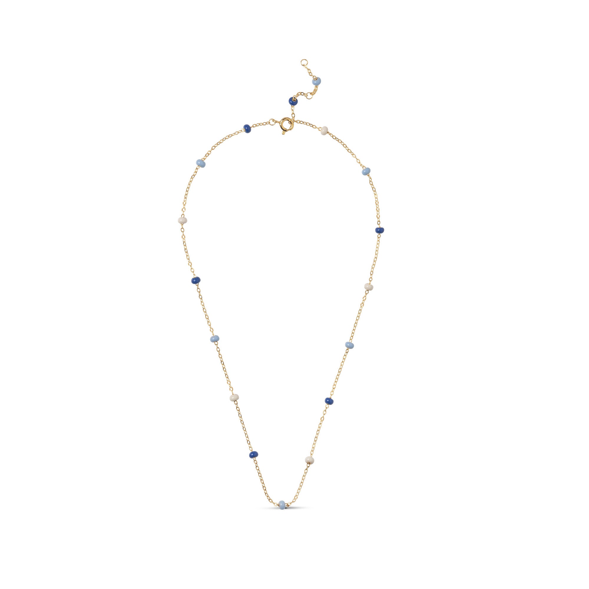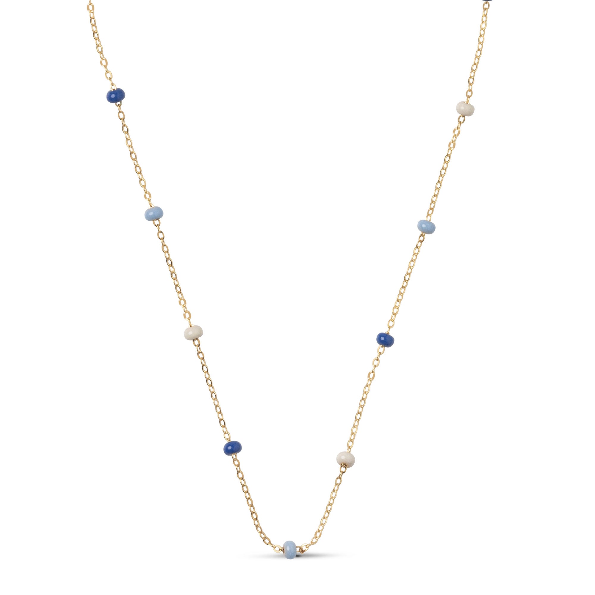 Dive into a world of blue hues with the Lola Bold necklace in the Marine color combination. The calm blue and beige enamel beads add sophisticated and elegant details to your outfit. The Lola Bold necklace from ENAMEL Copenhagen is made up of hand-painted enamel beads, which, due to their size, give the necklace a bit of extra character and fullness. The colorful enamel beads create a vibrant, colorful necklace, offering you both a cool and whimsical accessory. If the enamel beads are a bit too bold for you, consider checking out our Lola necklace. The Lola Bold necklace is available in a variety of beautiful color combinations, making it easy to find your favorite.Note: Take care NOT to wear our Lola styles in the shower, while you sleep, or too close to perfumes and lotions, as the enamel may change color and texture.
