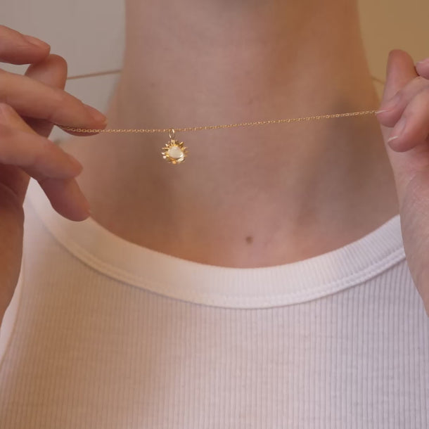 About the necklace:The Sunshine necklace with a beige center has an exclusive and sweet expression. The Sunshine necklace in the colour Daisy is for the calm, sweet person who has a big heart and a loyal character. The Sunshine necklace is a perfect gift idea for the person who brings a smile to your face. The pendant of the necklace depicts a sun or a sunflower, depending on the eyes looking at it, and has a classic yet different expression. The design is handmade, and the enamel is applied by hand.