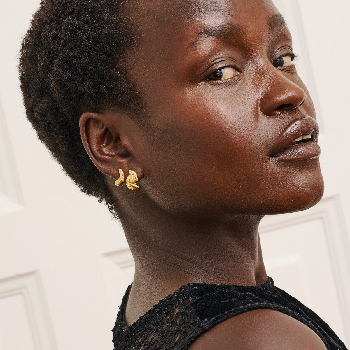 About the jewelry:Nima Stud is a small, elegant earring with a soft, organic shape and a gently rippled surface. The shiny finish gives it an exclusive touch, and the compact design makes it ideal for both everyday and more refined looks. Wear it alone for a minimalist expression – or combine with several styles for a personal styling. Nima stud is coated with 18 karat gold, but is also available in a silver version.